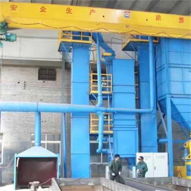 澆注完成後,用吊車将砂箱和鑄件吊至慣性振動落砂機,經落砂處理後,将鑄件運至刮刀房,砂箱運至砂箱倉(cāng)庫備(bèi)用。大塊的皮在提升管内人工分揀,經過落砂格栅的沙子、沙球、小塊冷鐵落到磁選皮帶機上。磁選後,輸送到多功能振動破碎再生器進行破碎、脫模和篩分。篩分後的砂進入鬥式提升機,提升至離心轉子二次再生器進行強力再生,充分脫模。混合有微粉、粉塵和樹脂膜的再生砂通過砂槽流入簾式風選機,風選機連接旋風除塵器和脈沖反吹除塵器,去除微粉和粉塵。再生砂由氣力輸送機構輸送至砂倉(cāng)備(bèi)用。移動式雙臂連續樹脂砂混砂機上方的進料口通過氣動活塞與砂倉(cāng)下方的出砂口連接。按下混砂機電控箱中的混砂按鈕後,氣動閘闆會自動打開,一定量的砂會從砂倉(cāng)流入混砂機。在混砂機中,砂子通過螺旋葉片向前輸送到混砂起始端,固化劑從近端控制閥加入,砂子通過小葉片預混,樹脂加入後面的近端閥進入混砂端。固化劑、樹脂和再生砂充分混合後,送到前出料口,自動流入準備(bèi)好的砂箱中進行造型和制芯。